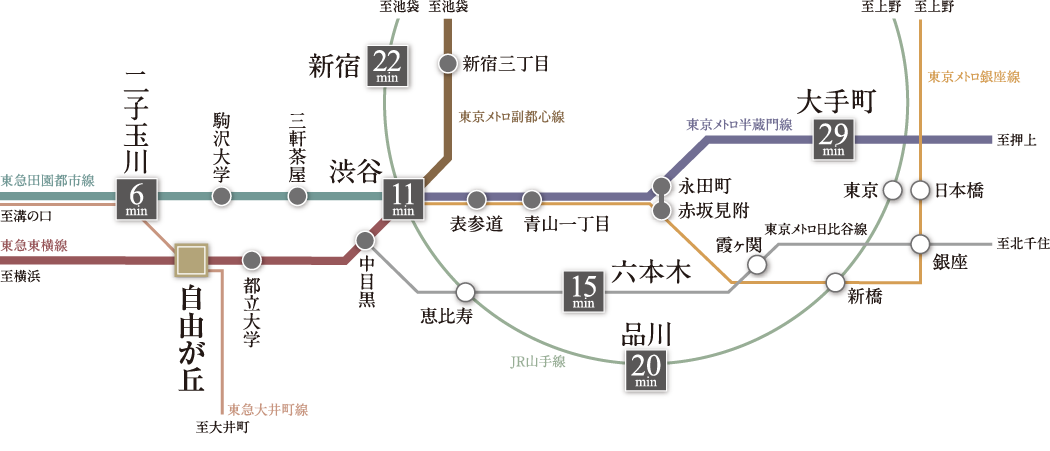 ※「品川」駅:東急大井町線利用、「大井町」駅でJR京浜東北線に乗り換え(日中時18分:東急大井町線急行利用、「大井町」駅でJR京浜東北線快速に乗り換え)。「新宿」駅:東急東横線急行利用、「渋谷」駅で東京メトロ副都心線通勤急行に乗り入れ、「新宿三丁目」駅で東京メトロ丸の内線に乗り換え(日中時19分:東京東横線Fライナー特急利用、「渋谷」駅で東京メトロ副都心線Fライナー急行に乗り入れ、「新宿三丁目」駅で東京メトロ丸の内線に乗り換え)。「六本木」駅:東急東横線急行利用、「中目黒」駅で東京メトロ日比谷線に乗り換え(日中時14分:東急東横線Fライナー特急利用、「中目黒」駅で東京メトロ日比谷線に乗り換え)。「大手町」駅:東急大井町線利用、「大岡山」駅で東急目黒線急行に乗り換え、「目黒」駅で都営三田線に乗り入れ(日中時28分:東急大井町線利用、「大岡山」駅で東急目黒線急行に乗り換え、「目黒」駅で都営三田線に乗り入れ)。