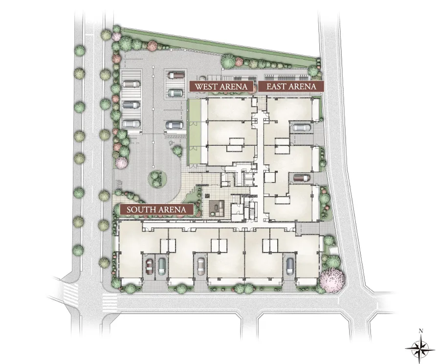 ※敷地内の樹木等はある程度生育した後をイメージして描いたものです。また、葉や花の色合い、樹形等はイメージであり実際とは異なります。尚、植栽計画は変更される場合がありますので、あらかじめご了承ください。