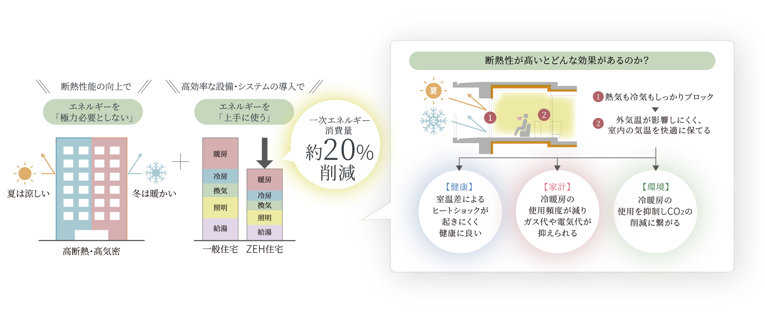 ゼッチ・マンション・オリエンテッドとは、 断熱性能の向上、高効率設備の導入により、室内の快適性を 保ちながら、熱を逃さず、電気やガスの利用量を抑え、 共用部を含むマンション全体での一次エネルギー消費量を 約20%以上削減した環境、コスト、 健康に配慮した次世代基準のマンションです。