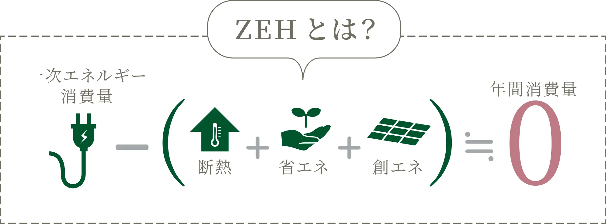 ZEHとは、「ネット・ゼロ・エネルギー・ハウス」の略。住宅の断熱・省エネ性を上げ、太陽光発電などによってエネルギーを創ることで、冷暖房や給湯、照明などの使用で消費される年間の一次エネルギー消費量ゼロを目指す。